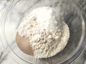 ![]() 1:ボールに強力粉、上白糖、塩、ドライイースト(塩から離して)を入れます。 |