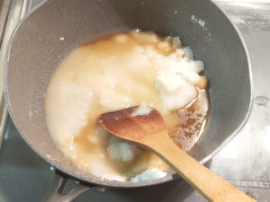 ![]() 15:鍋に、★デコレーションの上白糖、熱湯、ラム酒を入れて火にかけ、完全に溶かしてシロップを作りましょう。 (ドラマではお湯20ミリとなっていますが、どう考えても少ないので誤植だと思われます。) |