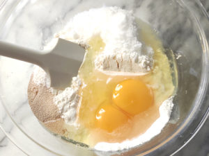 ![]() 2:卵も加えたら、へらなどで混ぜあわせましょう。 |