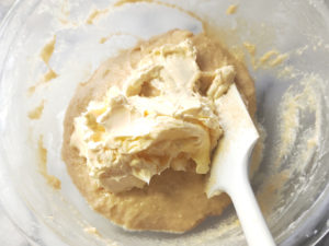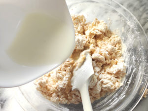 ![]() 3:レンジで10秒ほど温めた牛乳を3回に分けて加え、生地にぶつぶつがなくなるまで根気強く混ぜます。 |