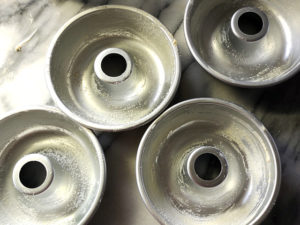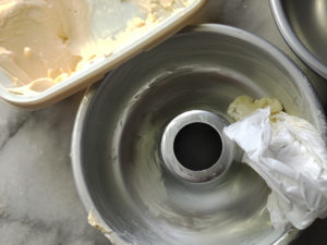 ![]() 7:エンゼル型にバターもしくはマーガリン(分量外)を、少し多めに塗ります。 (中央に塗るのを忘れずに!) |